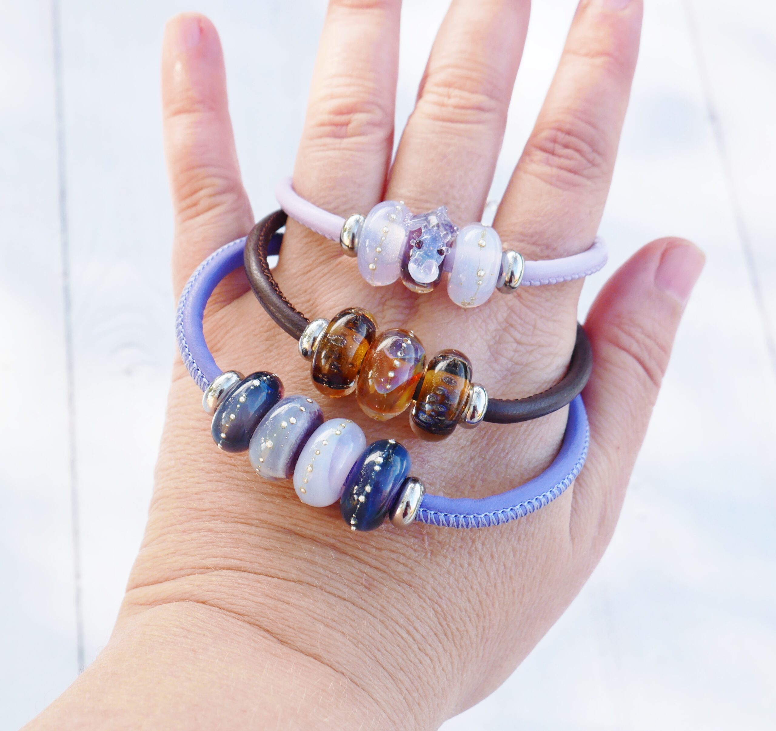 Les perles sont filées dans la flamme de mon chalumeau puis recuites au four professionnel pour lui assurer solidité et longévité.