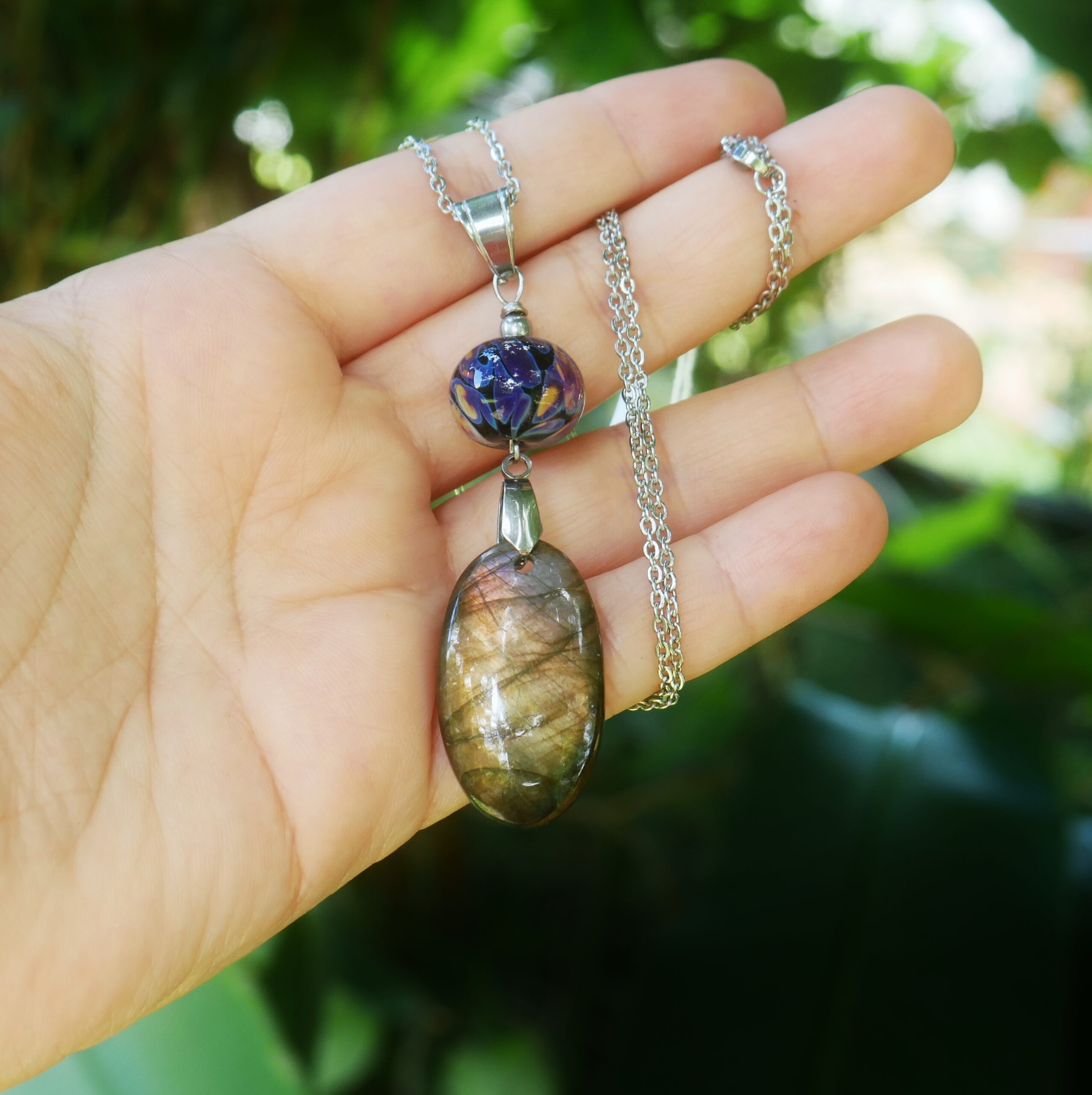 Un joli collier avec une jolie labradorite colorée aux multiples reflets. La pierre et la perle sont de taille petite, le collier est donc facile et léger à porter.