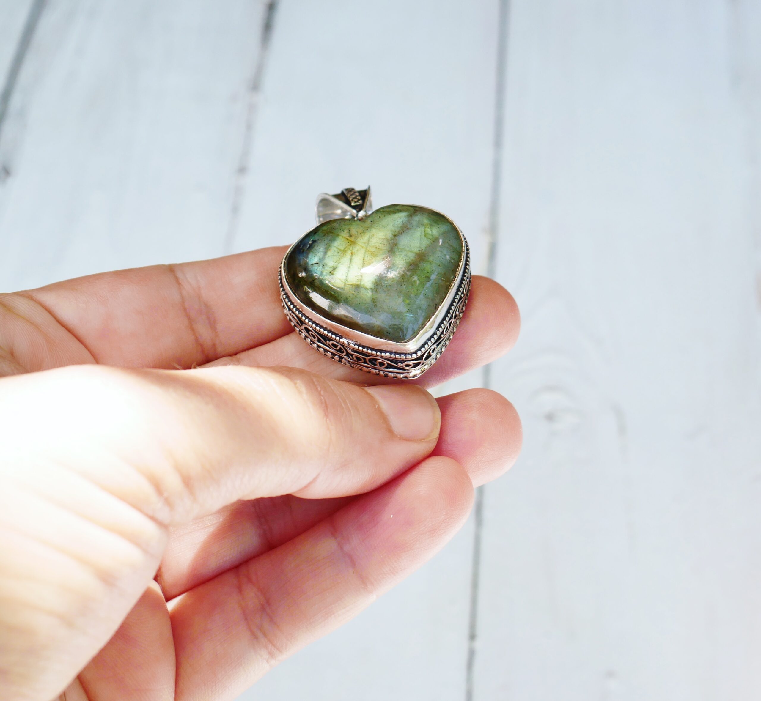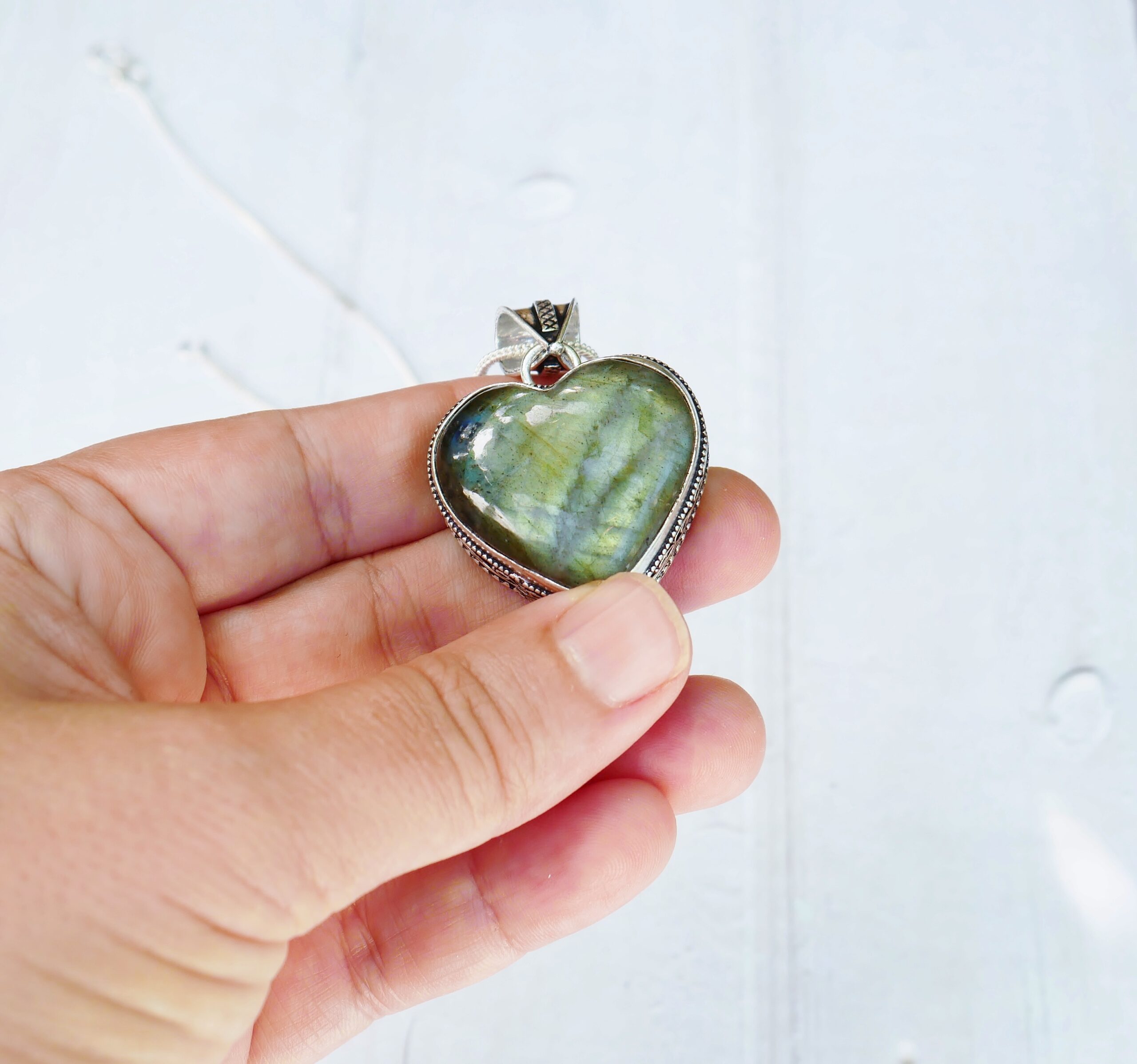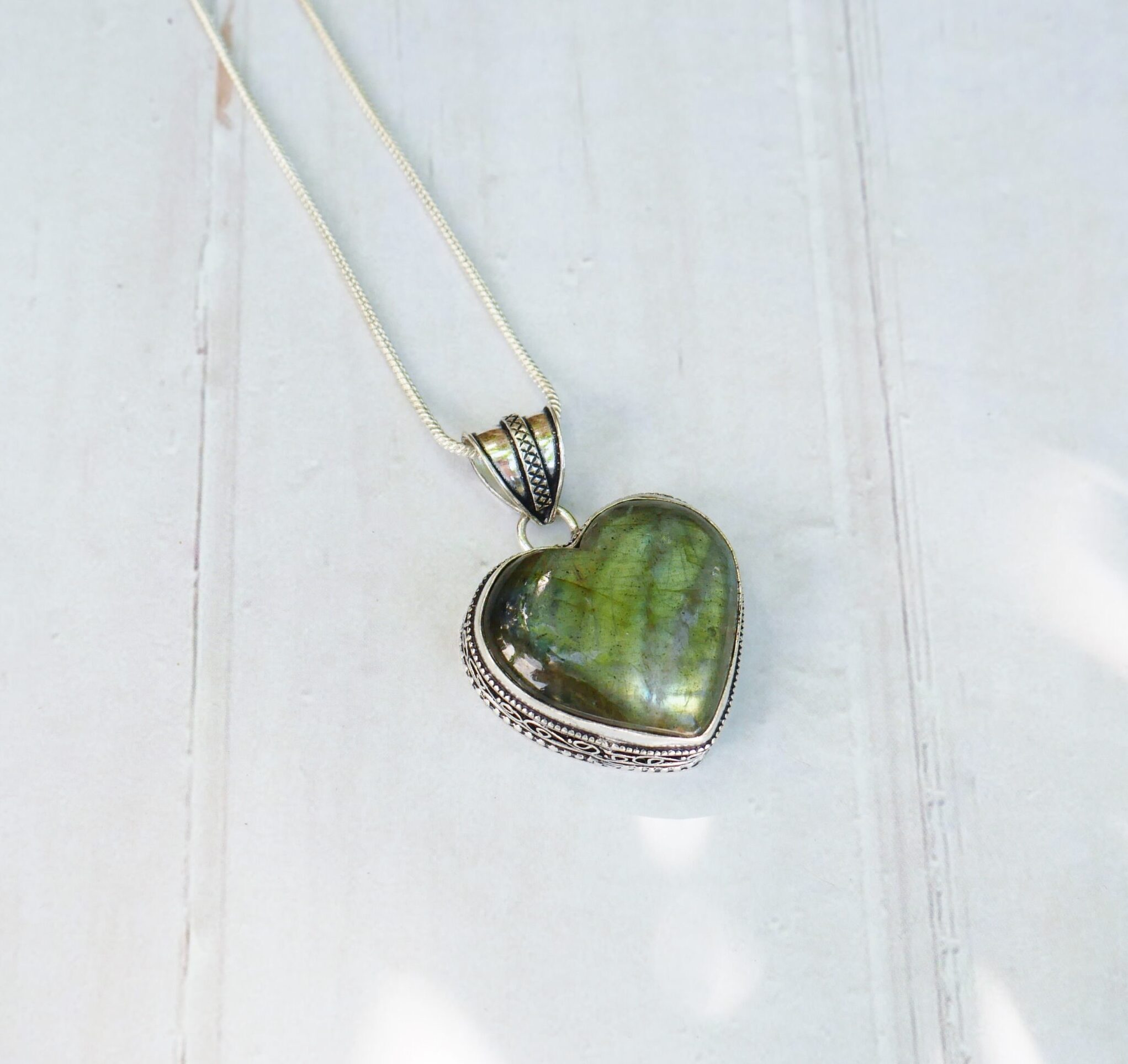 Un très joli collier avec son coeur en labradorite naturelle . Très jolis reflets verts