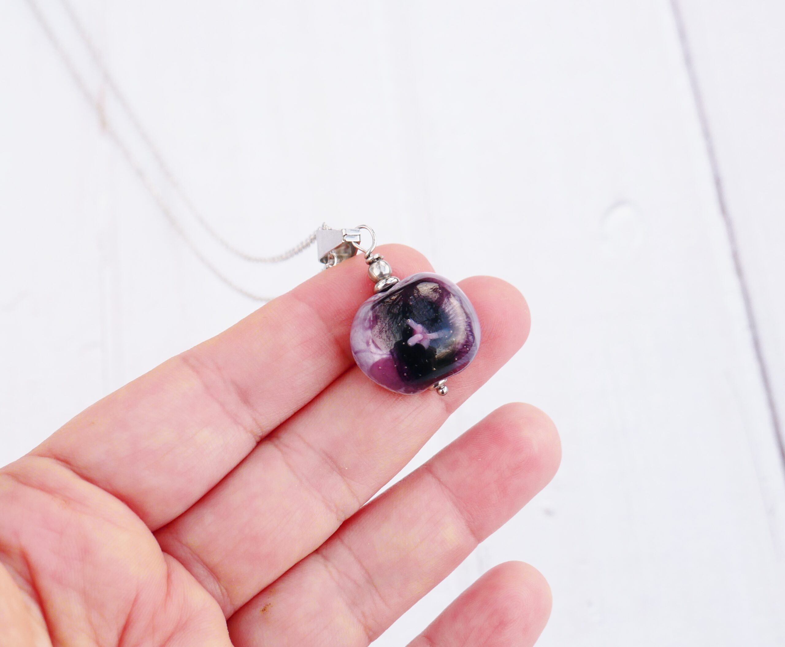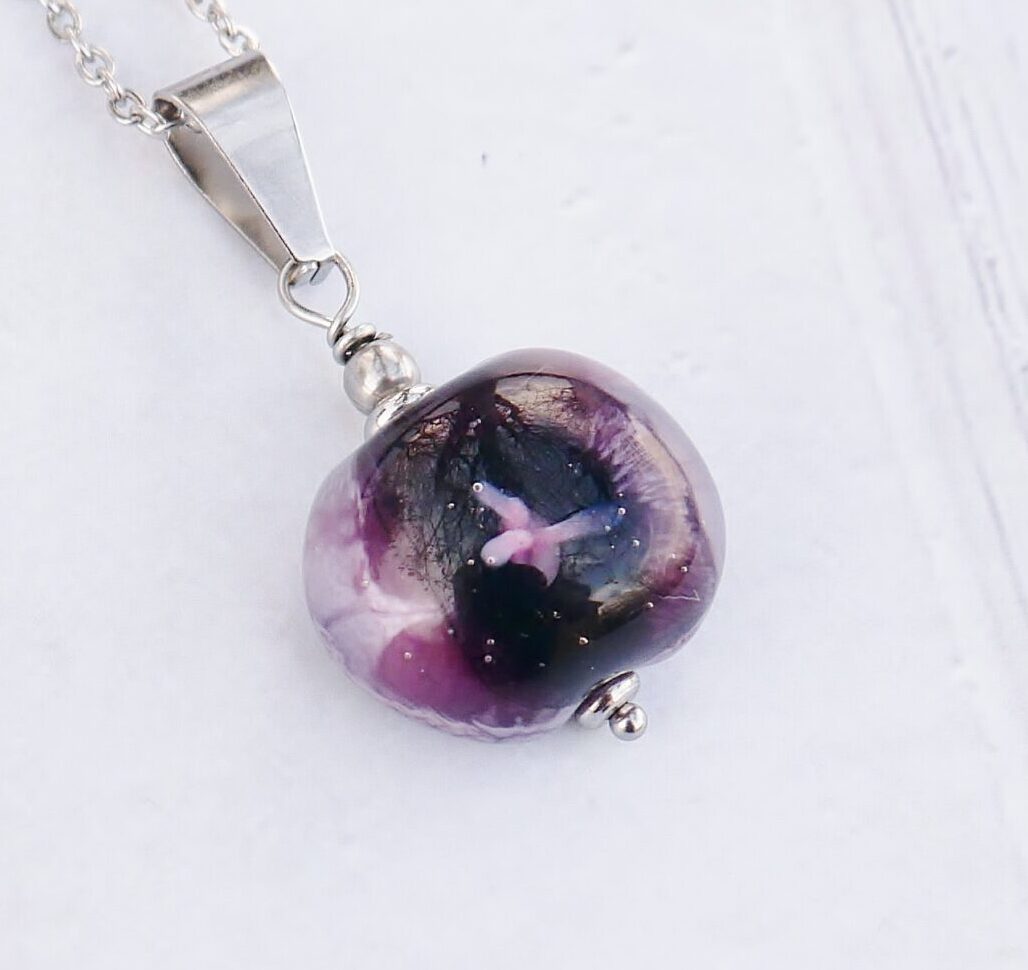 Un collier original avec cette perle violette et sa fleur noire/violette abstraite