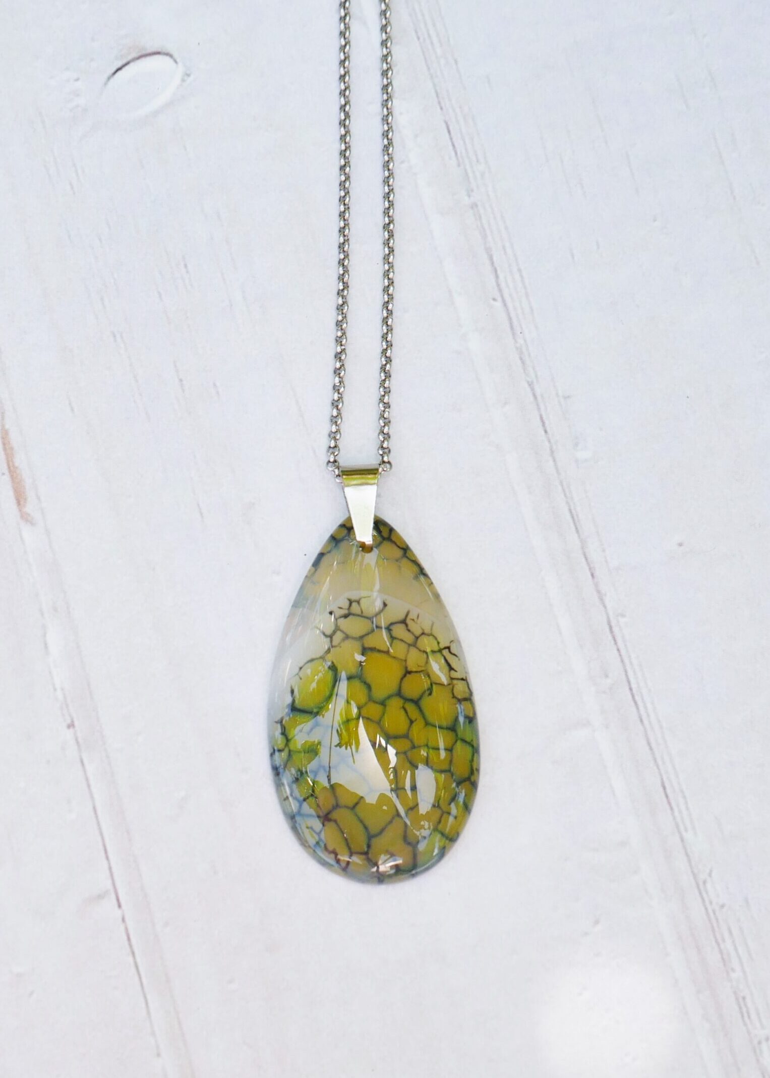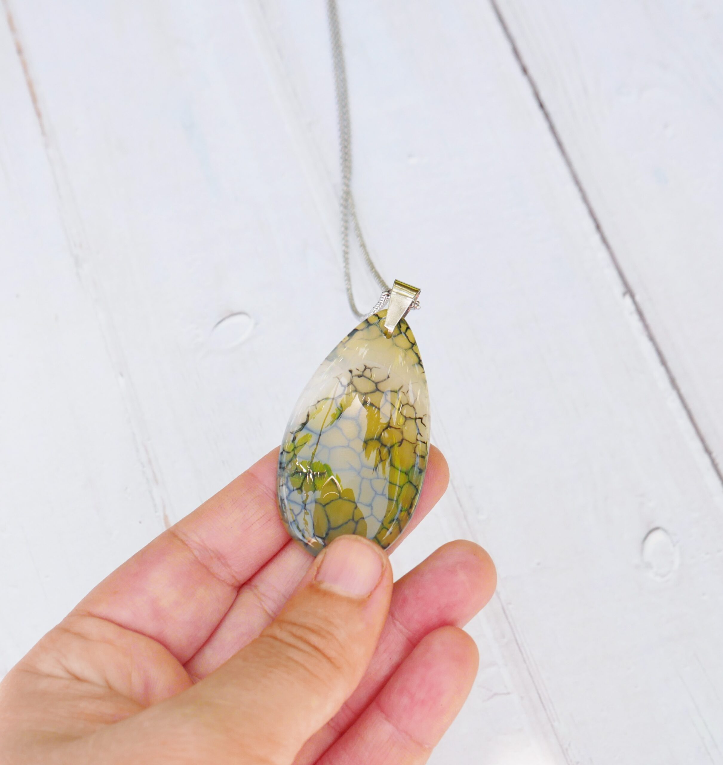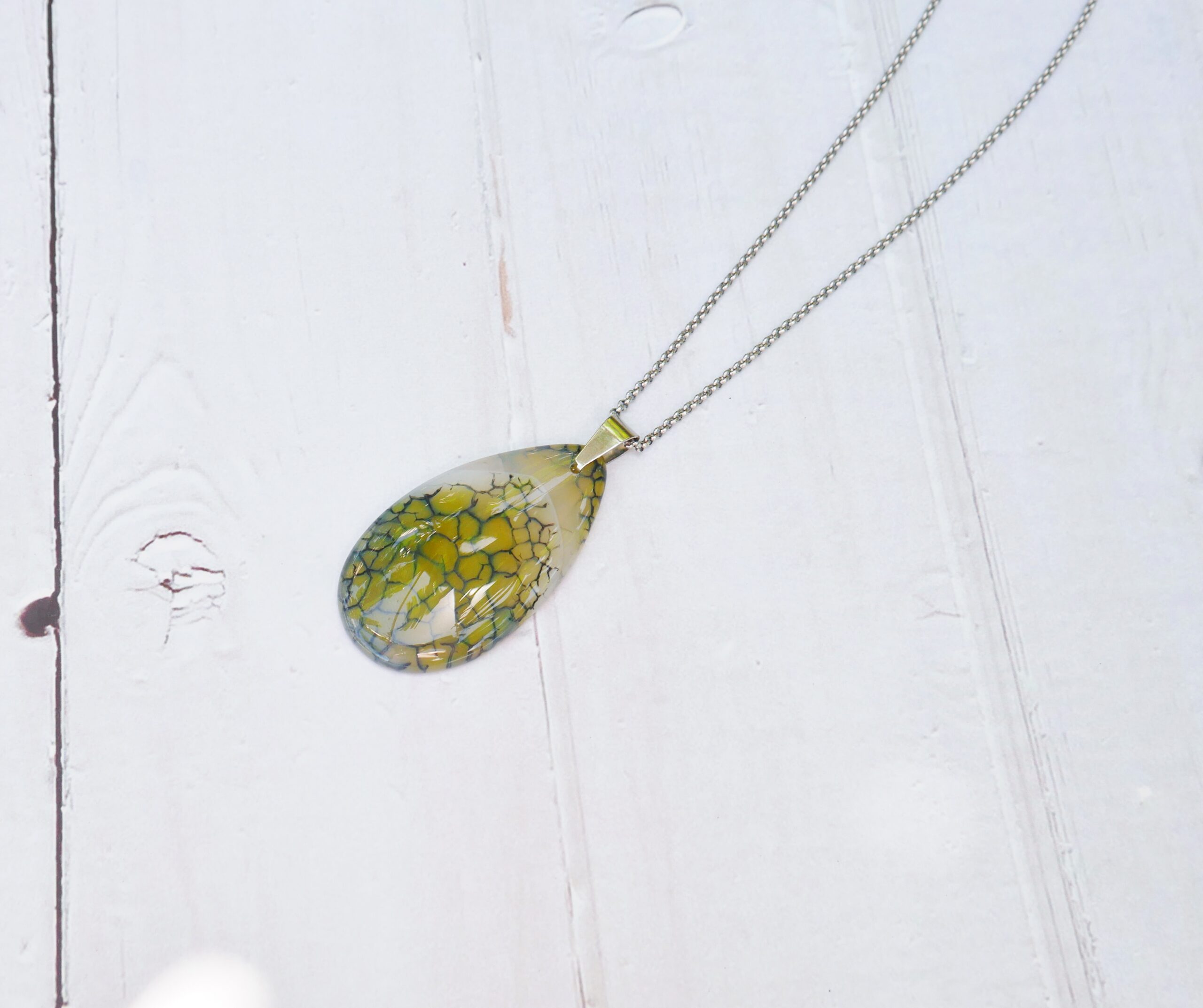 Un joli collier goutte en agate craquelée verte et blanche