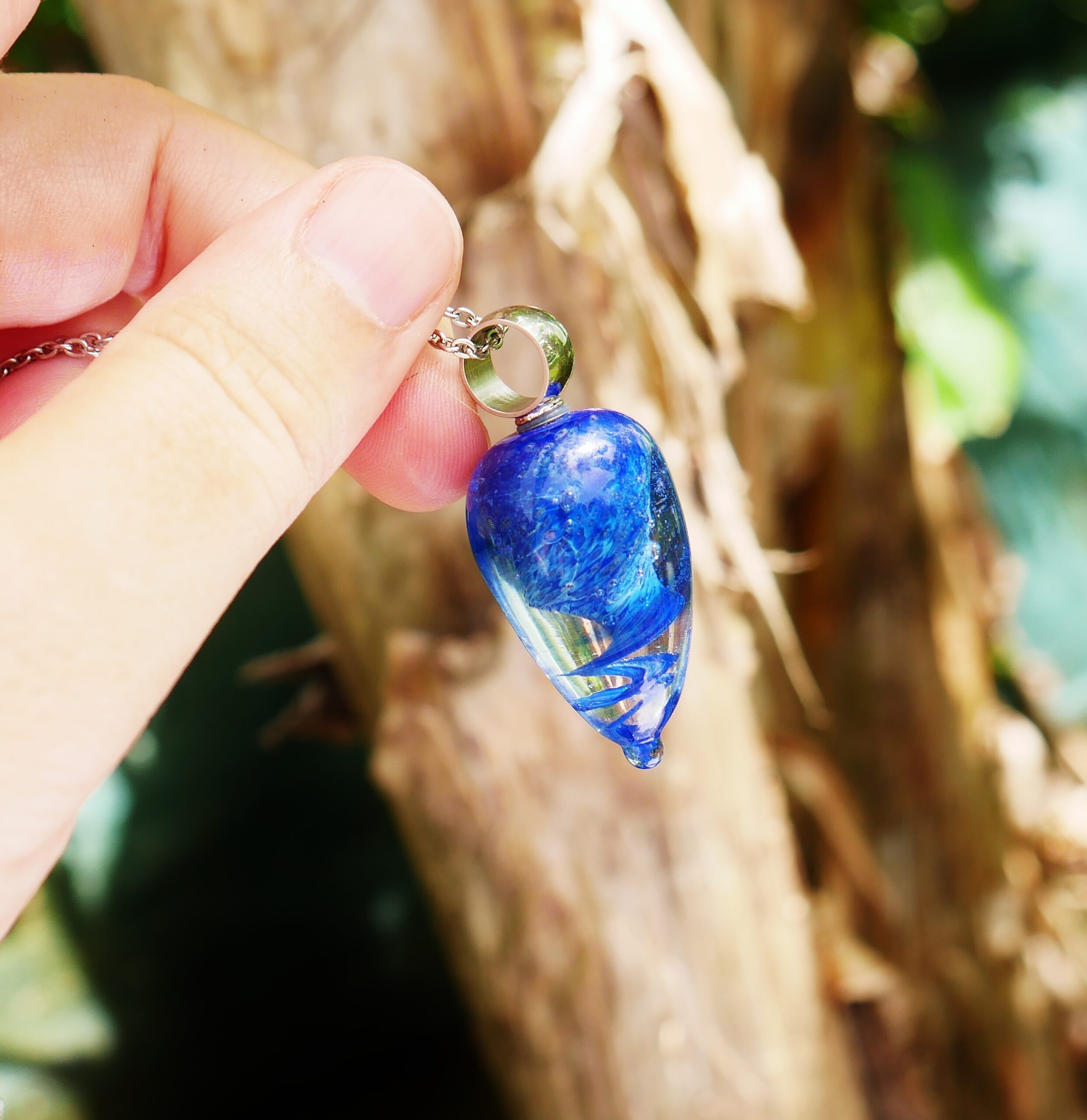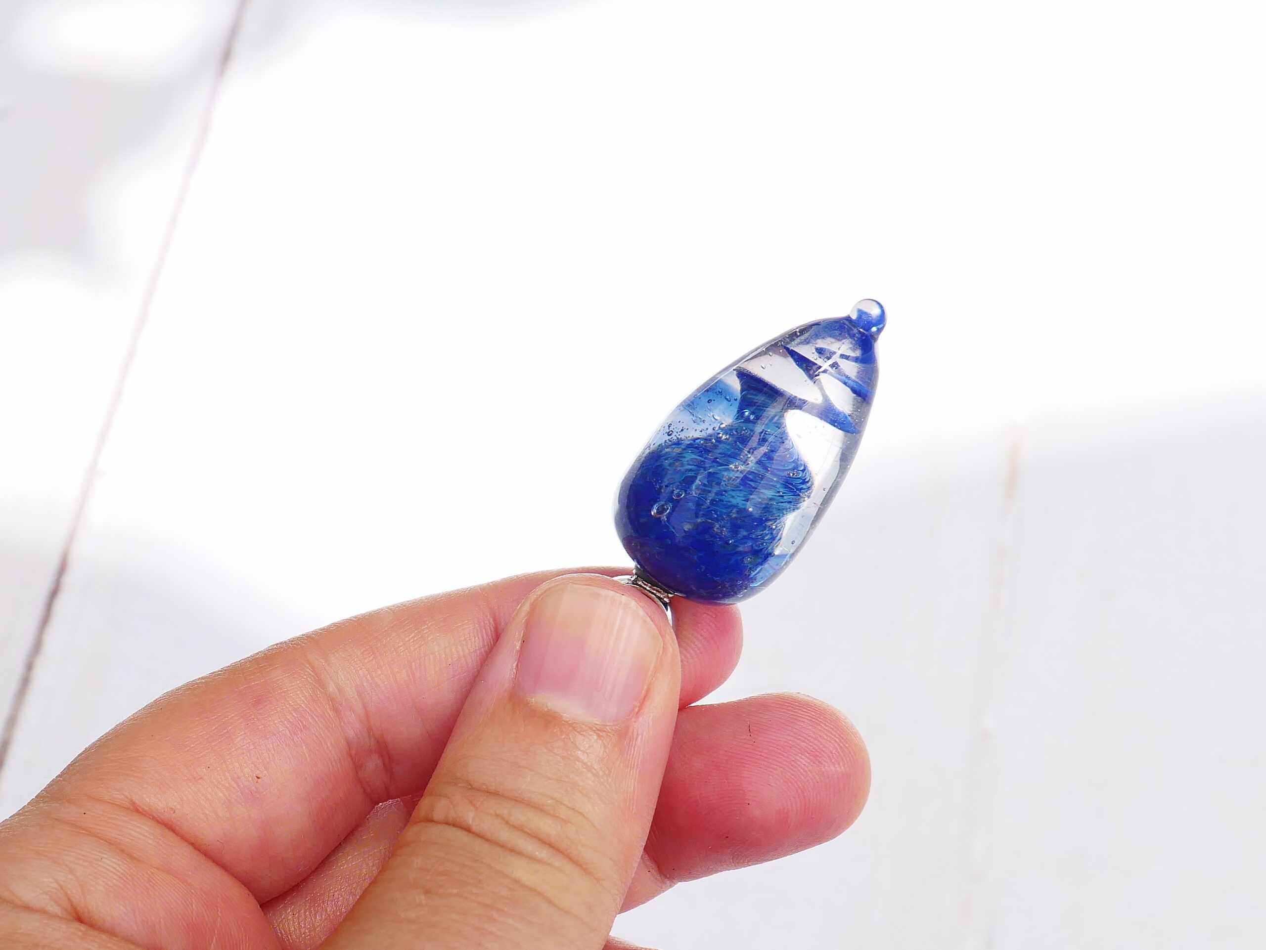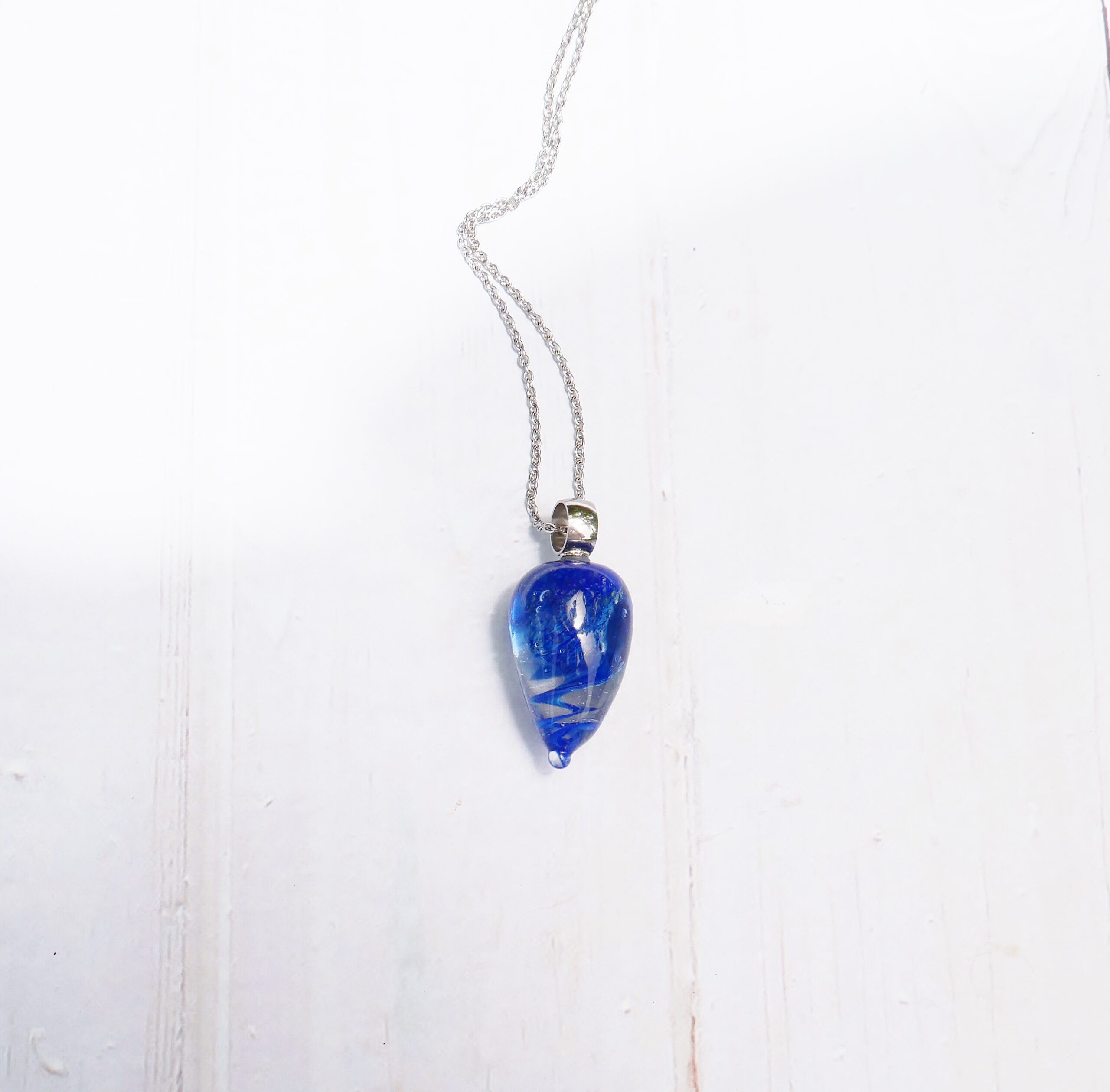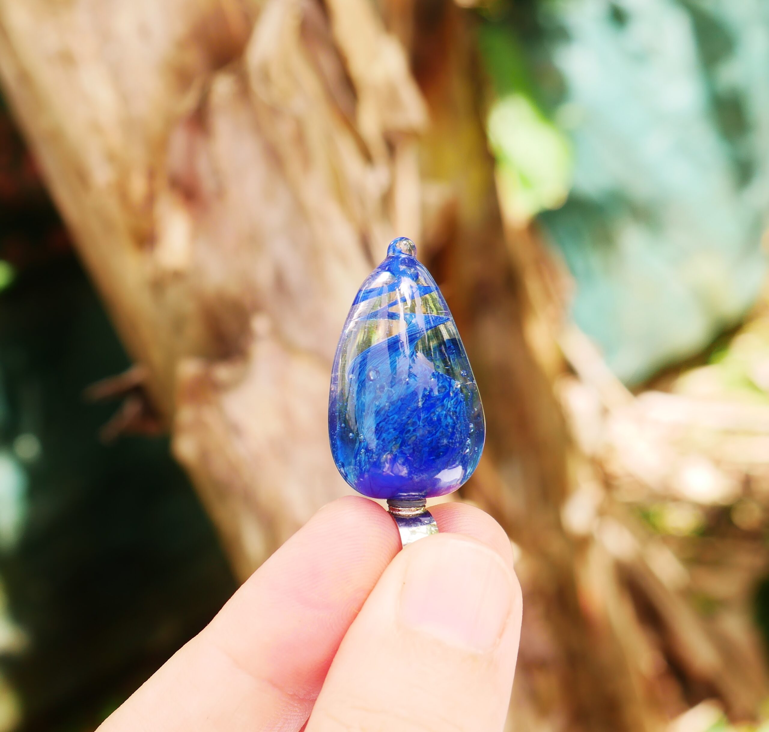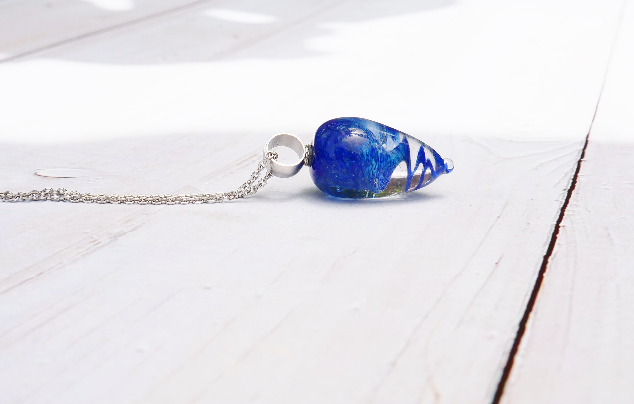 Un très beau collier en forme de goutte « Tempête en Mer ». La bélière se dévisse afin que la perle puisse être vissée sur d’autres supports.