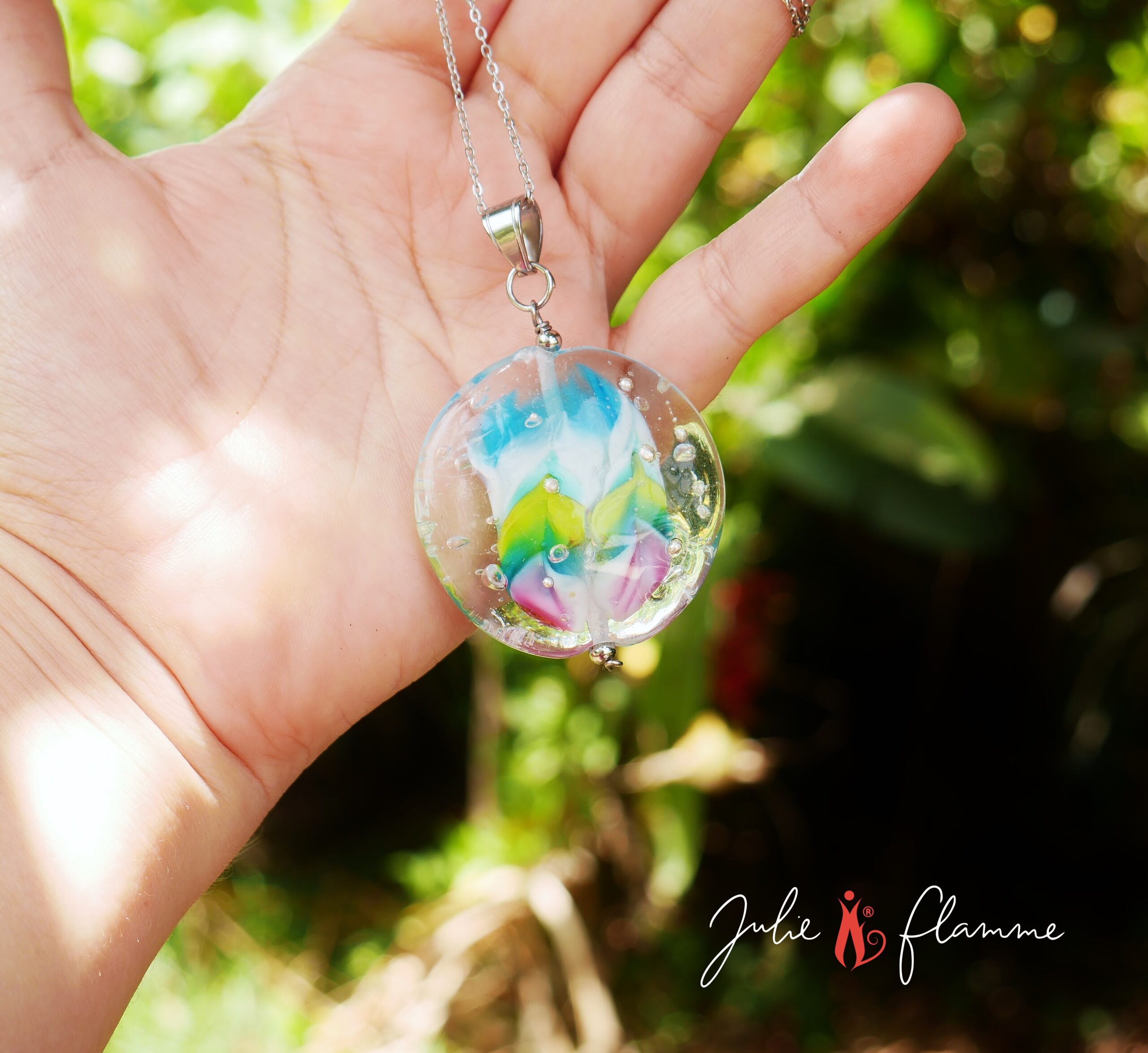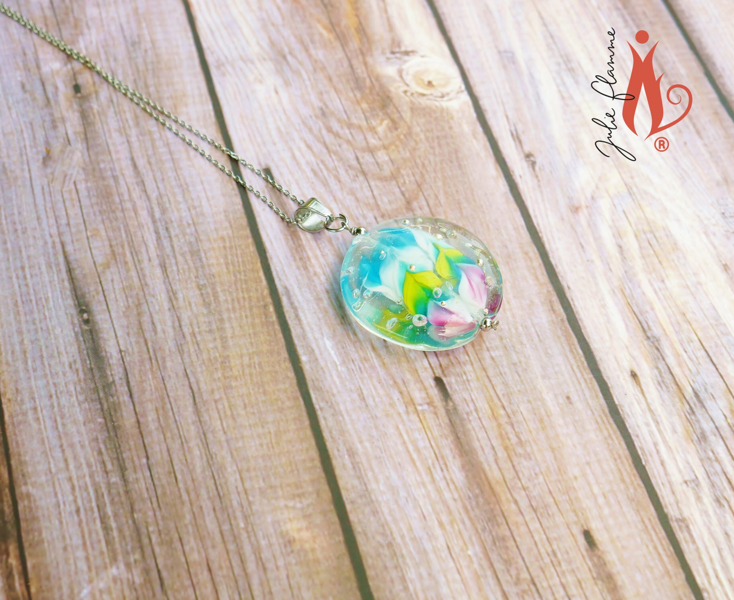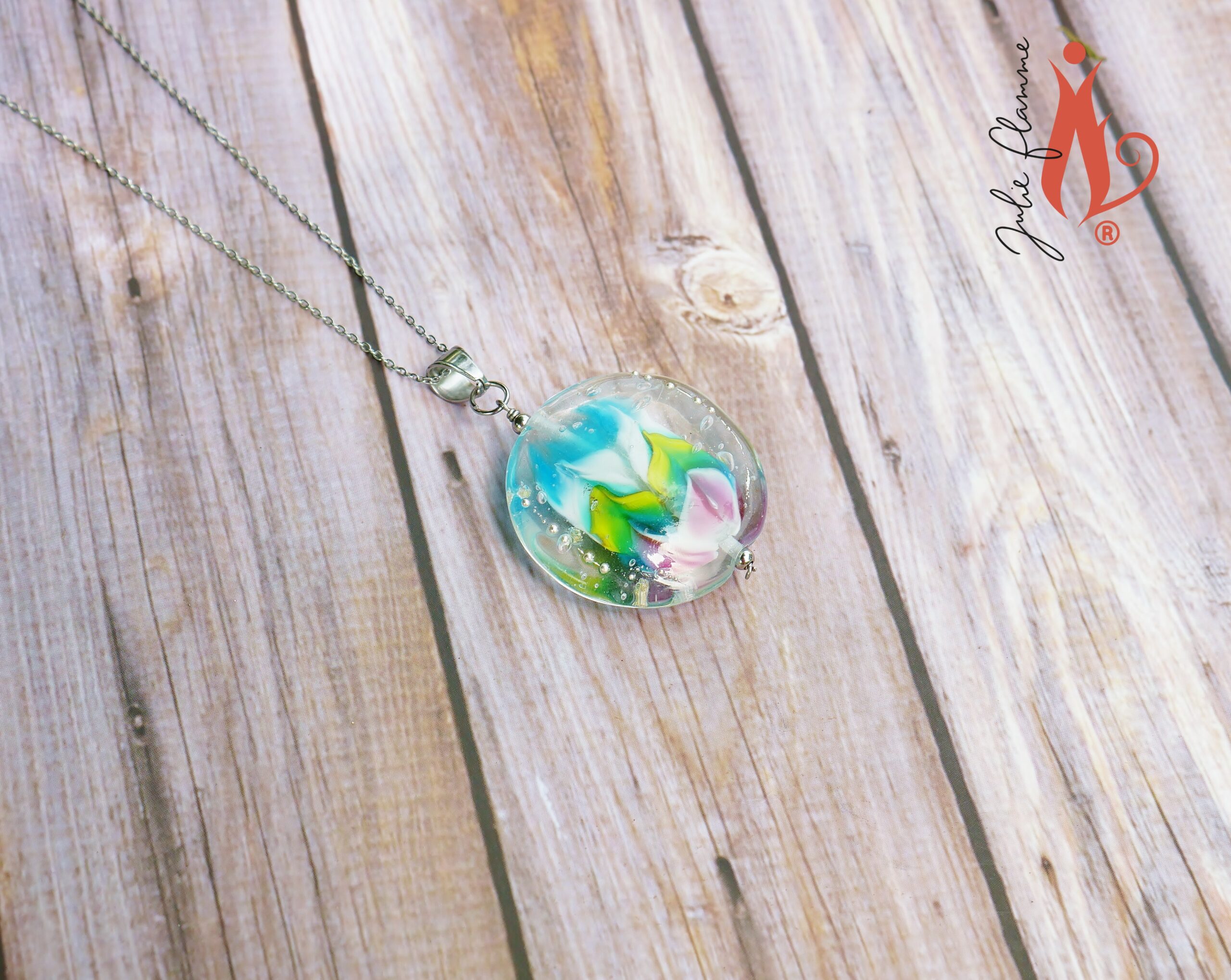 Voici un joli collier avec une grande perle en forme de lentille,  composée d’une superposition de différentes couleurs. Bijou unique, la perle a été longuement filée et travaillée dans la flamme de mon chalumeau puis recuite au four professionnel pour lui assurer solidité et longévité.
