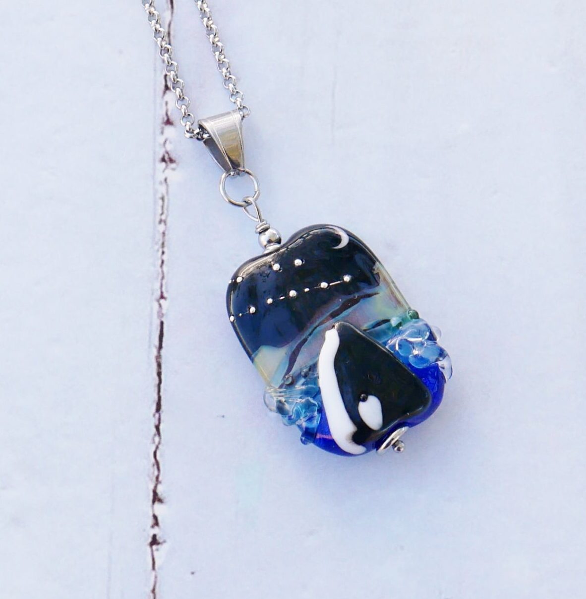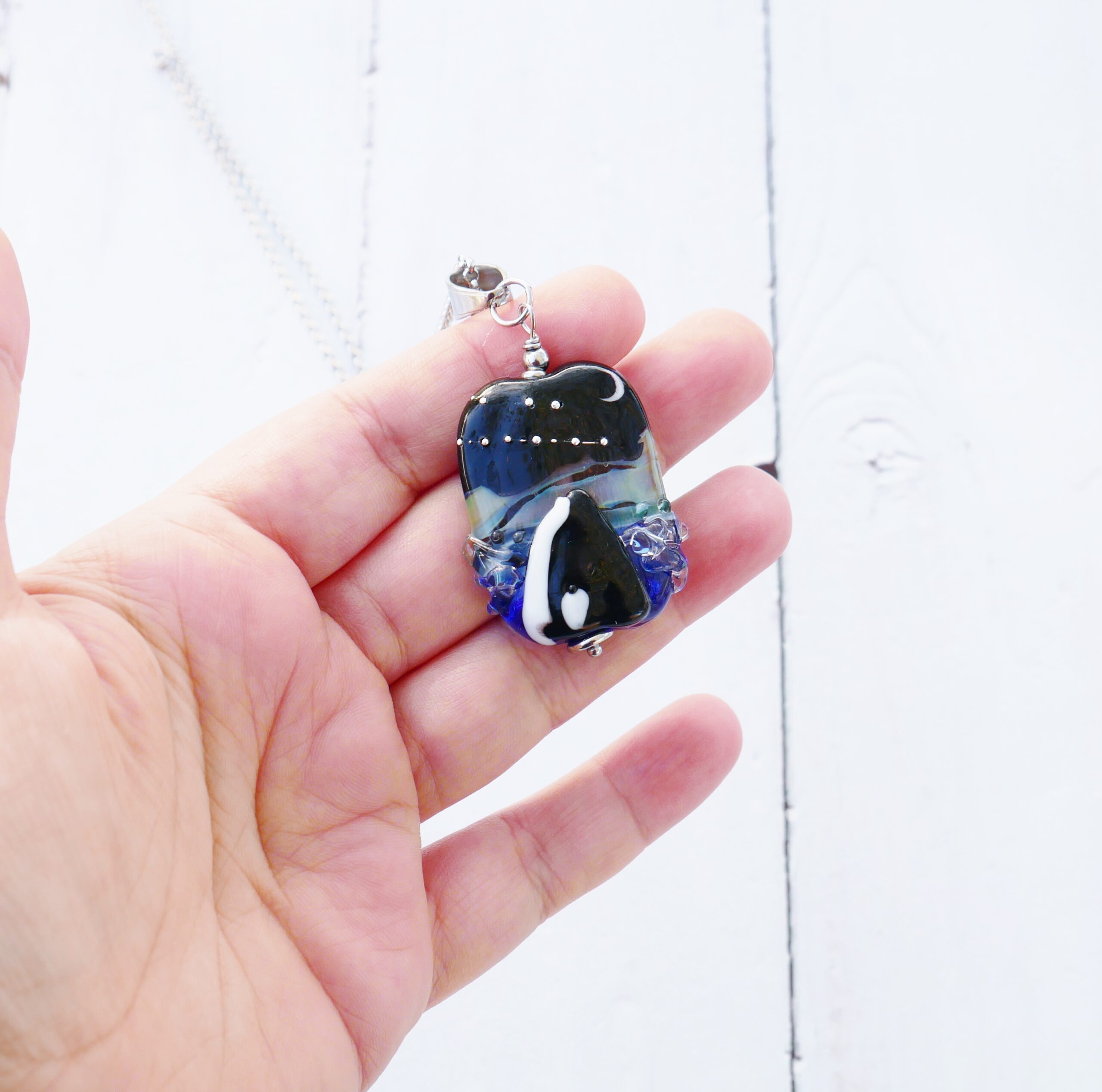 Collier avec un paysage nordique, une belle orque émergeant de la mer pour observer les alentours, sous la lune et les étoiles.