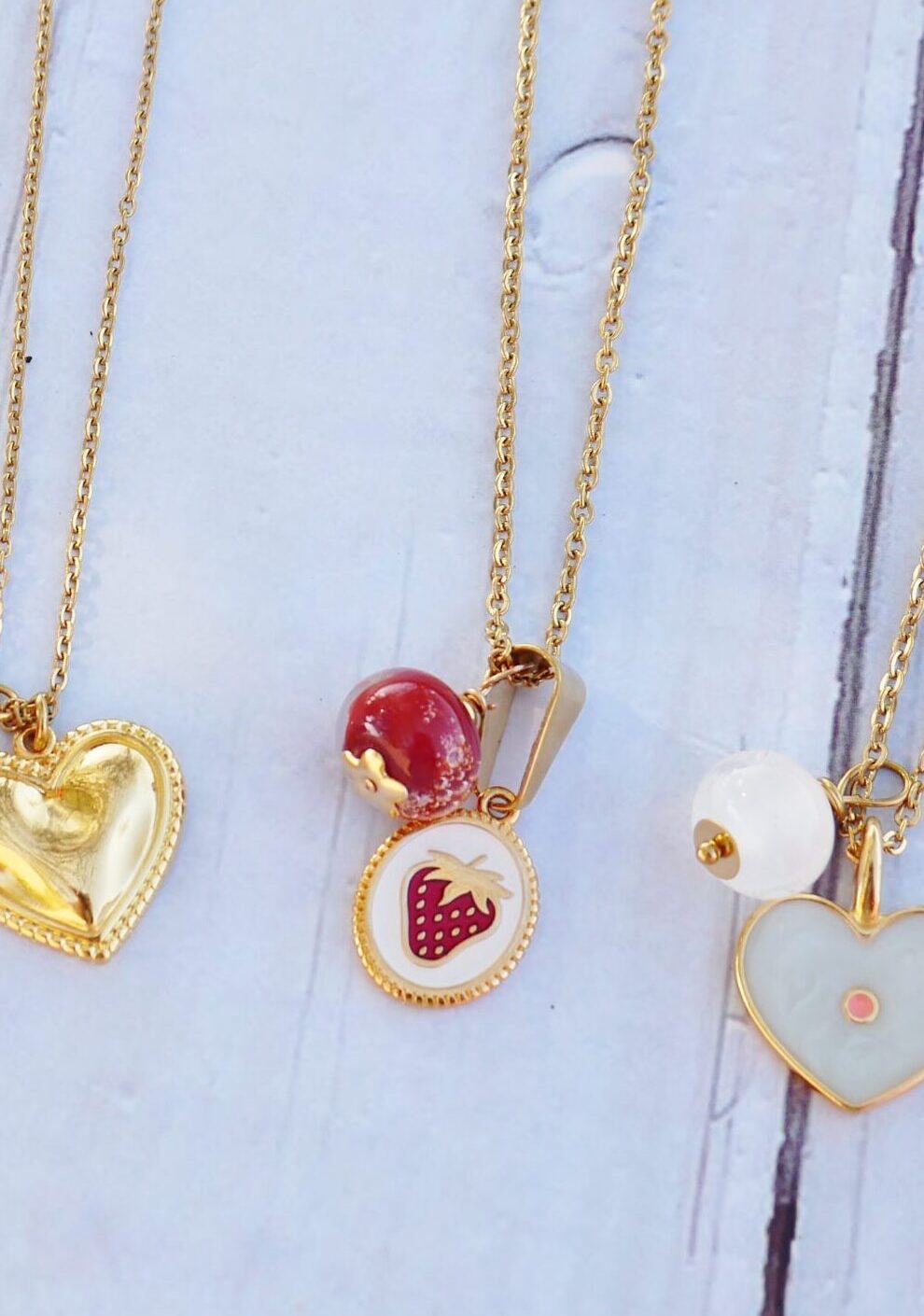 Joli collier en acier inoxydable, breloque petite fraise des bois en acier inoxydable et or 18K , perle de verre à bulles filée par mes soins.