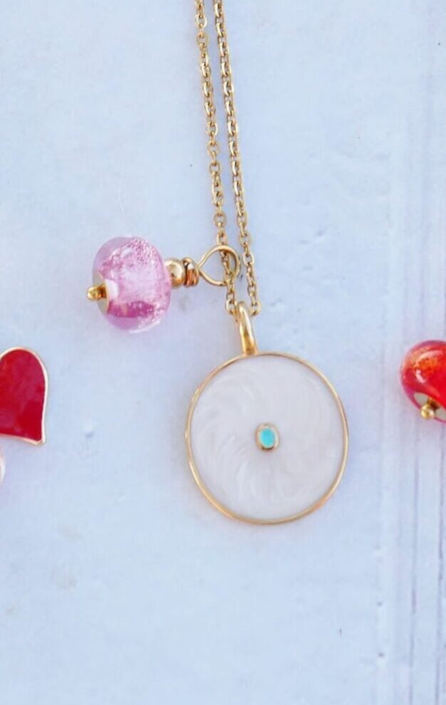 Joli collier en acier inoxydable, breloque rond blanc en résine avec en acier inoxydable et or 18K , perle de verre à bulles filée par mes soins.