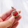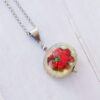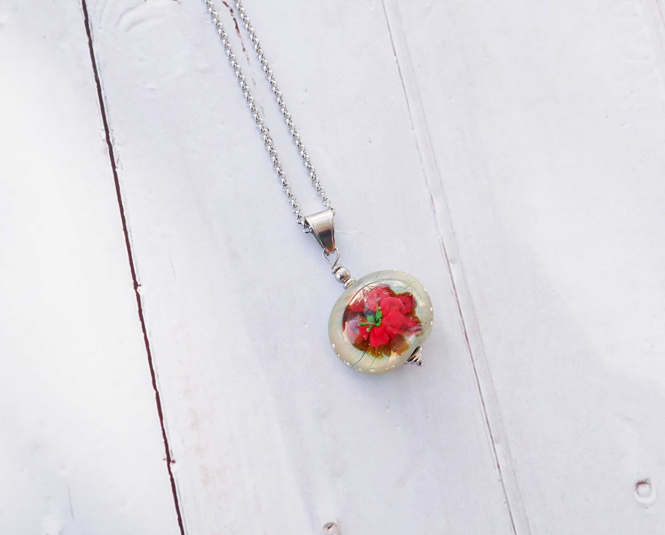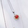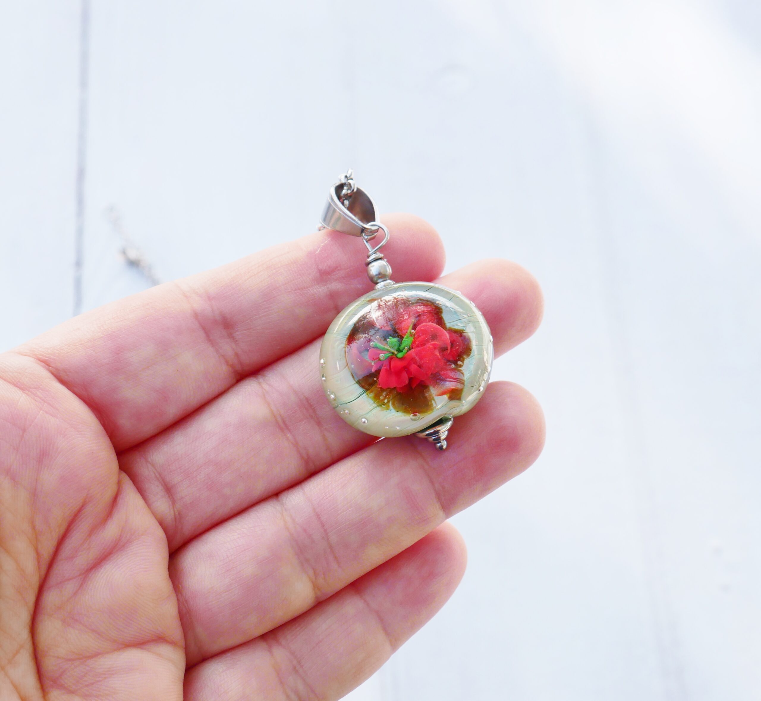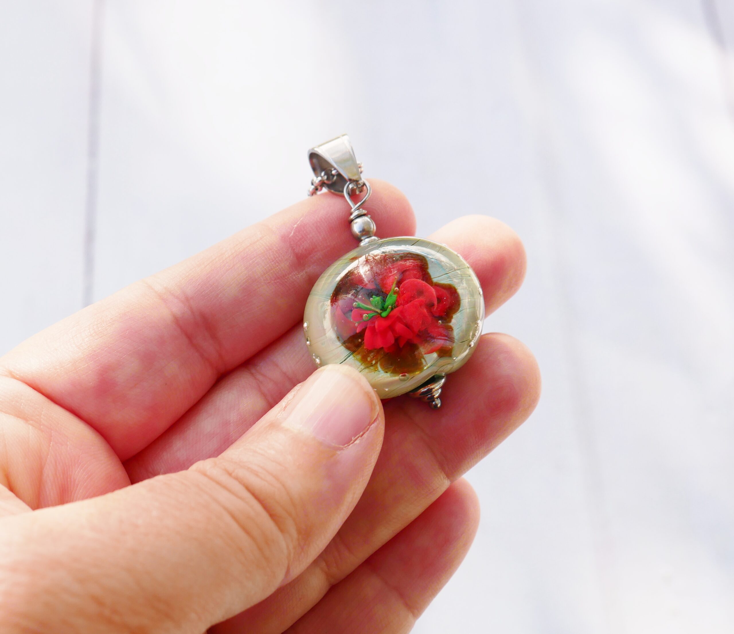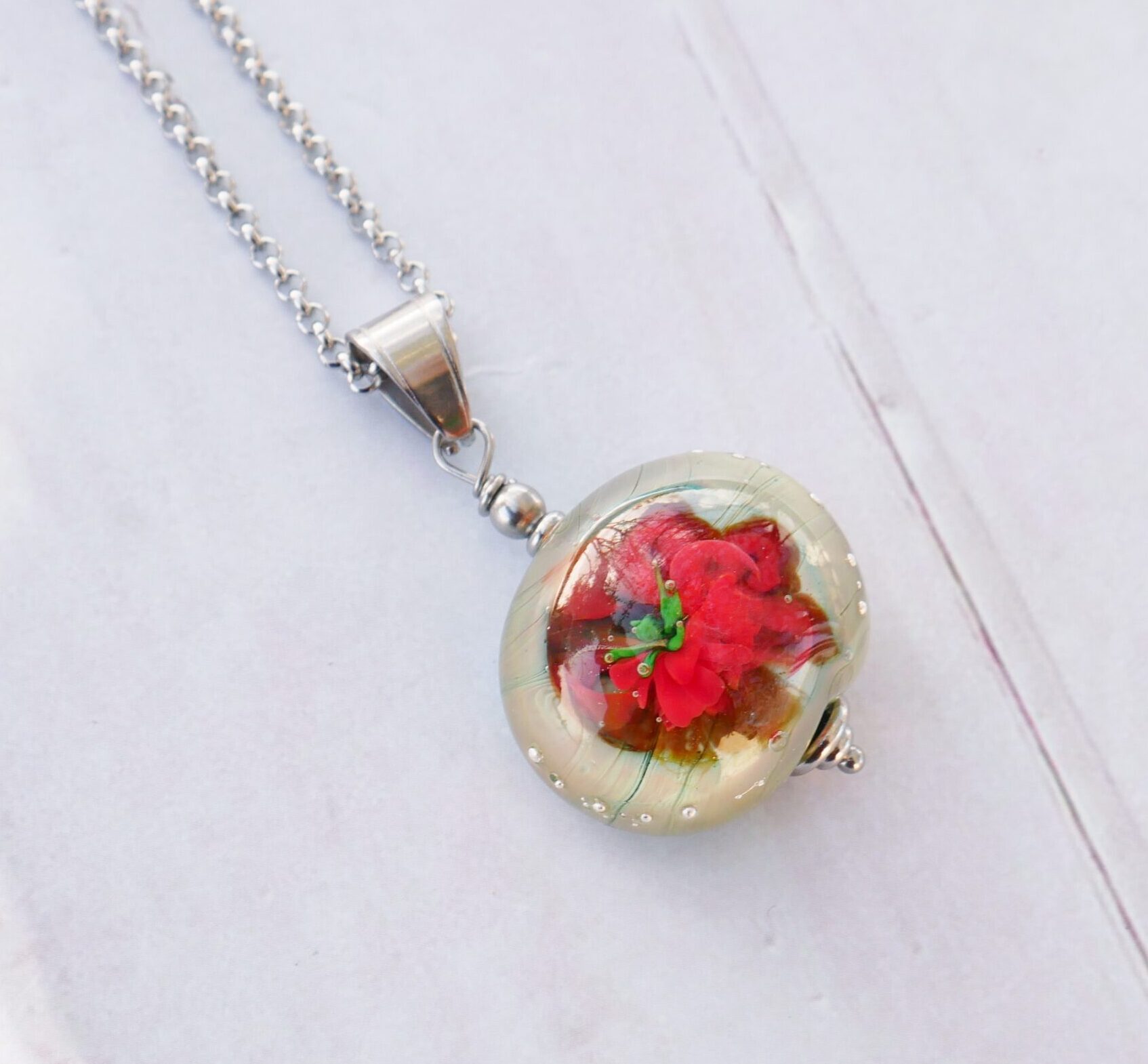 Collier romantique avec sa belle fleur rouge écarlate, comme une fleur sortie d’un rêve ou d’un pays imaginaire …