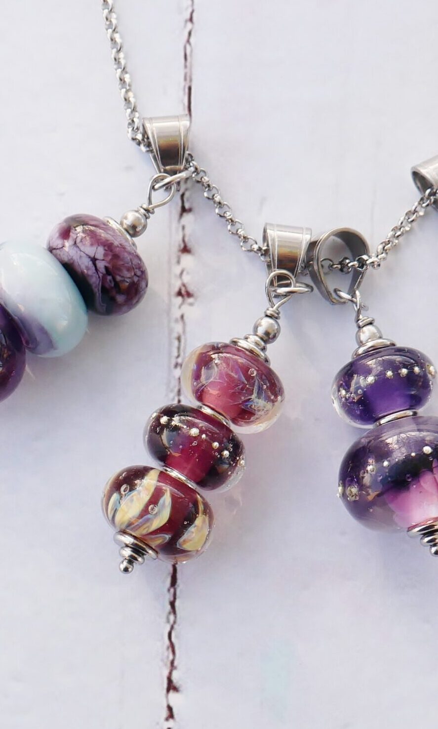 3 perles dans des tons améthyste et points d’argent pur 99.9%