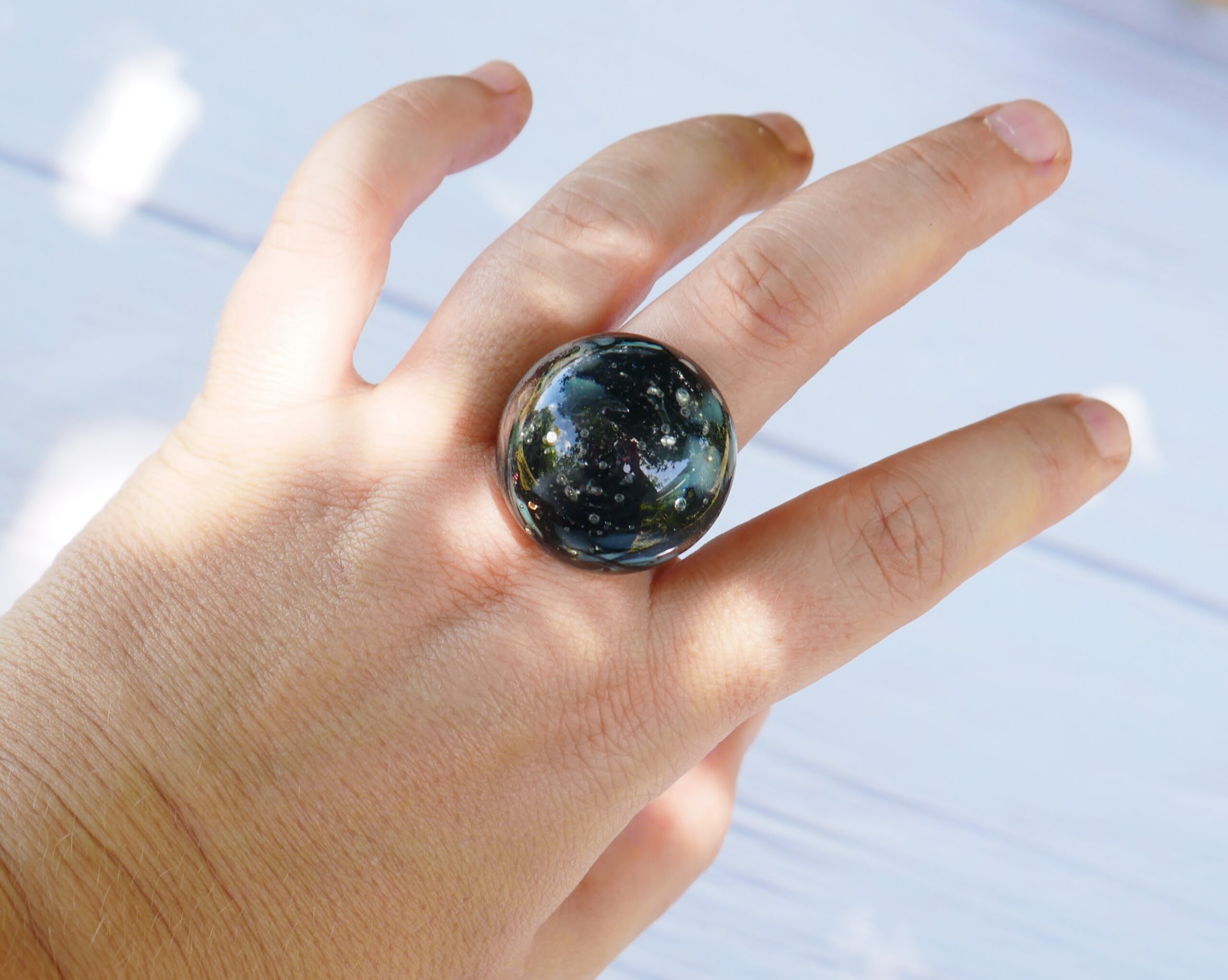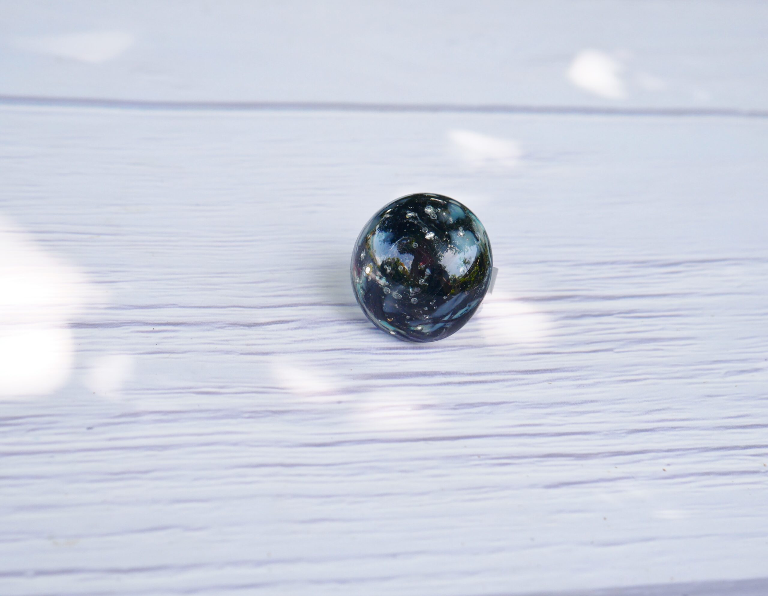Cabochon à visser ! Grosse bague cosmique avec des effets de profondeur et des points d’argent pur 99.9% à la surface !
