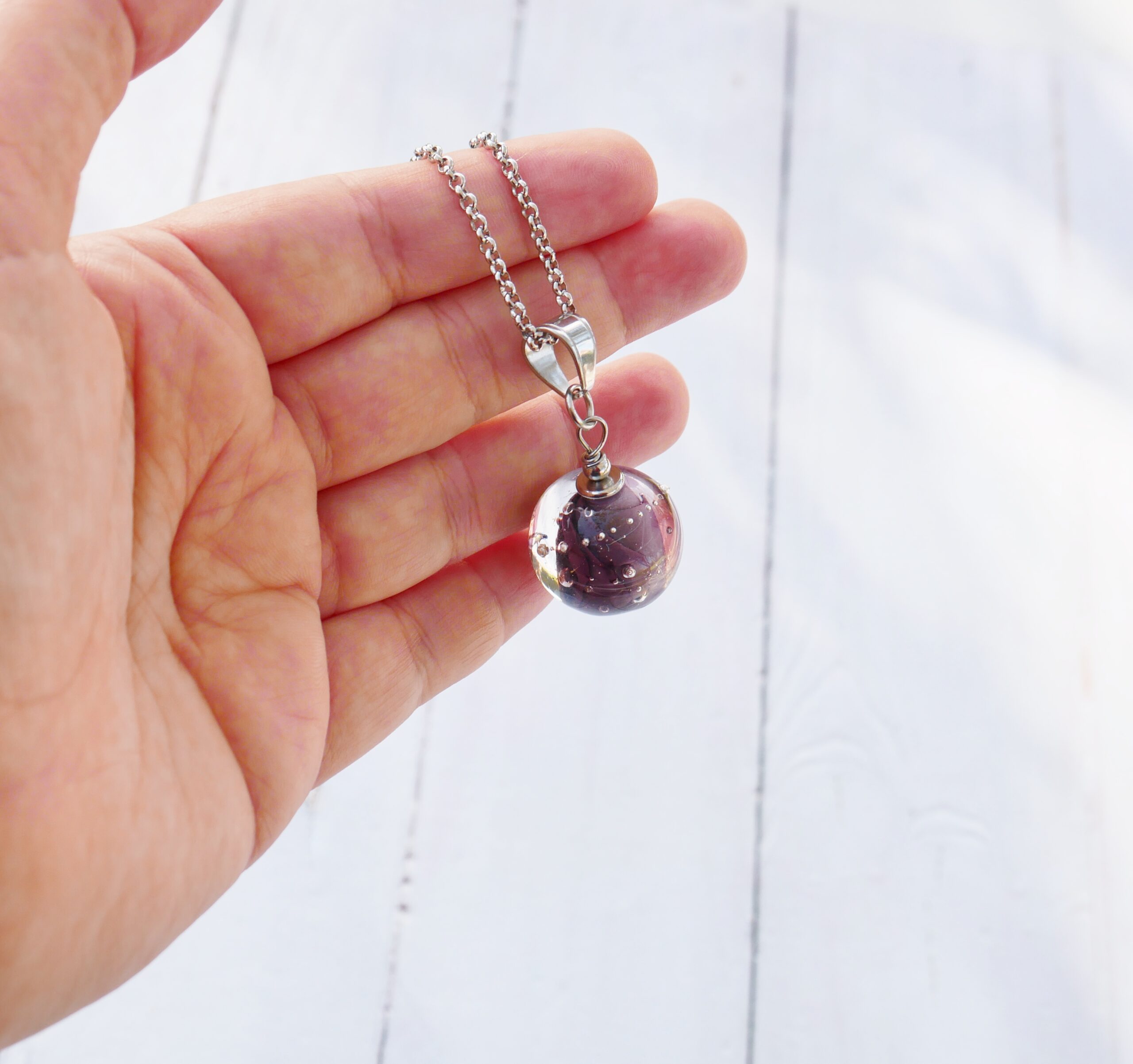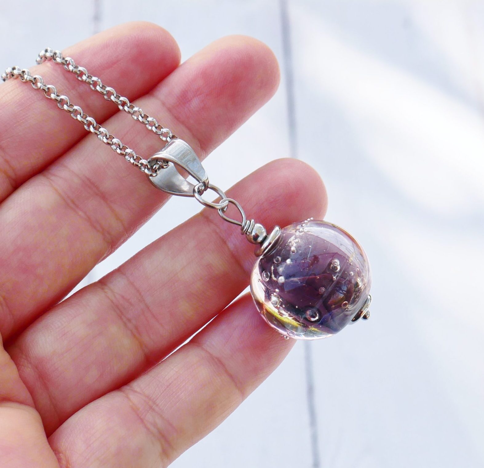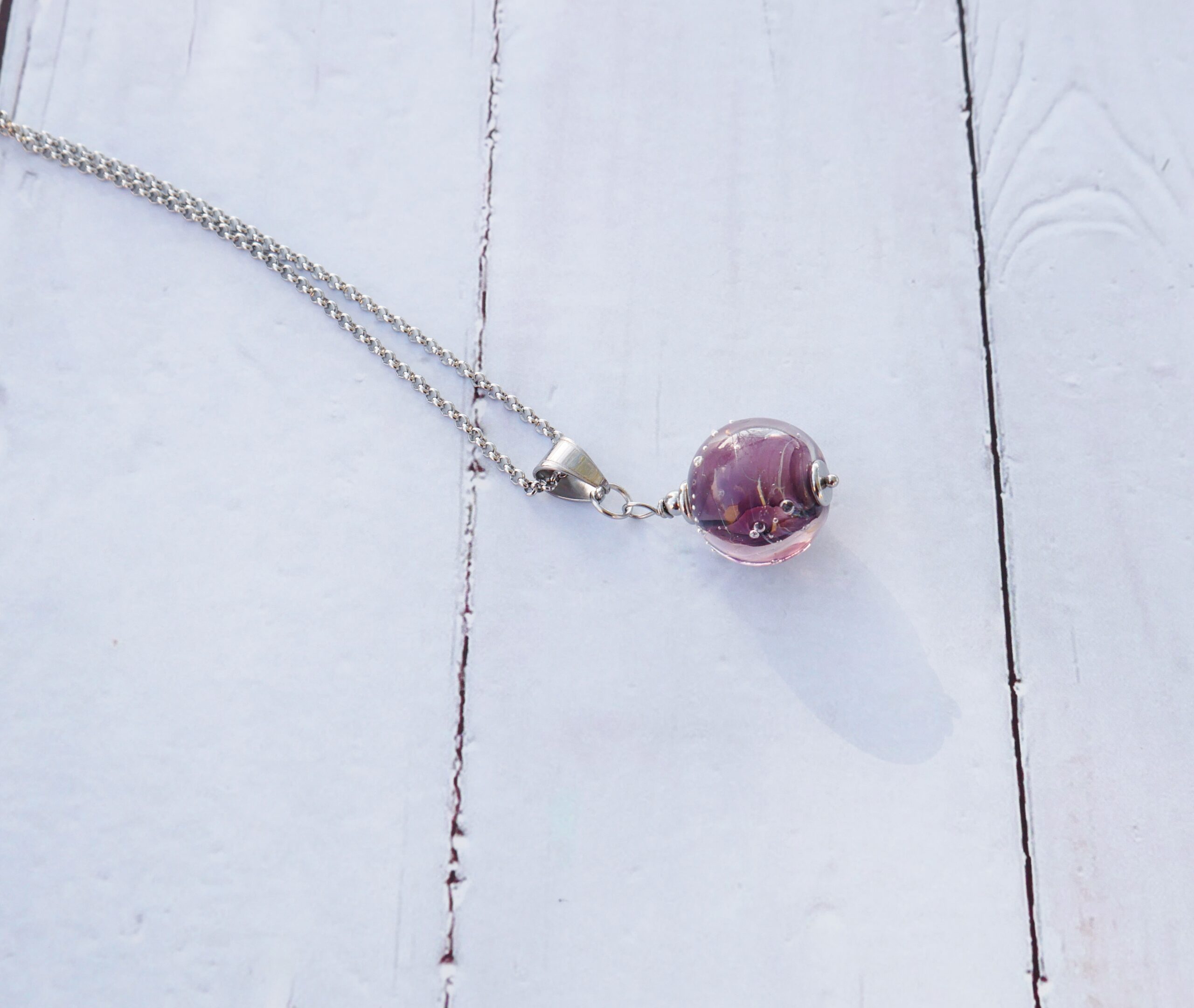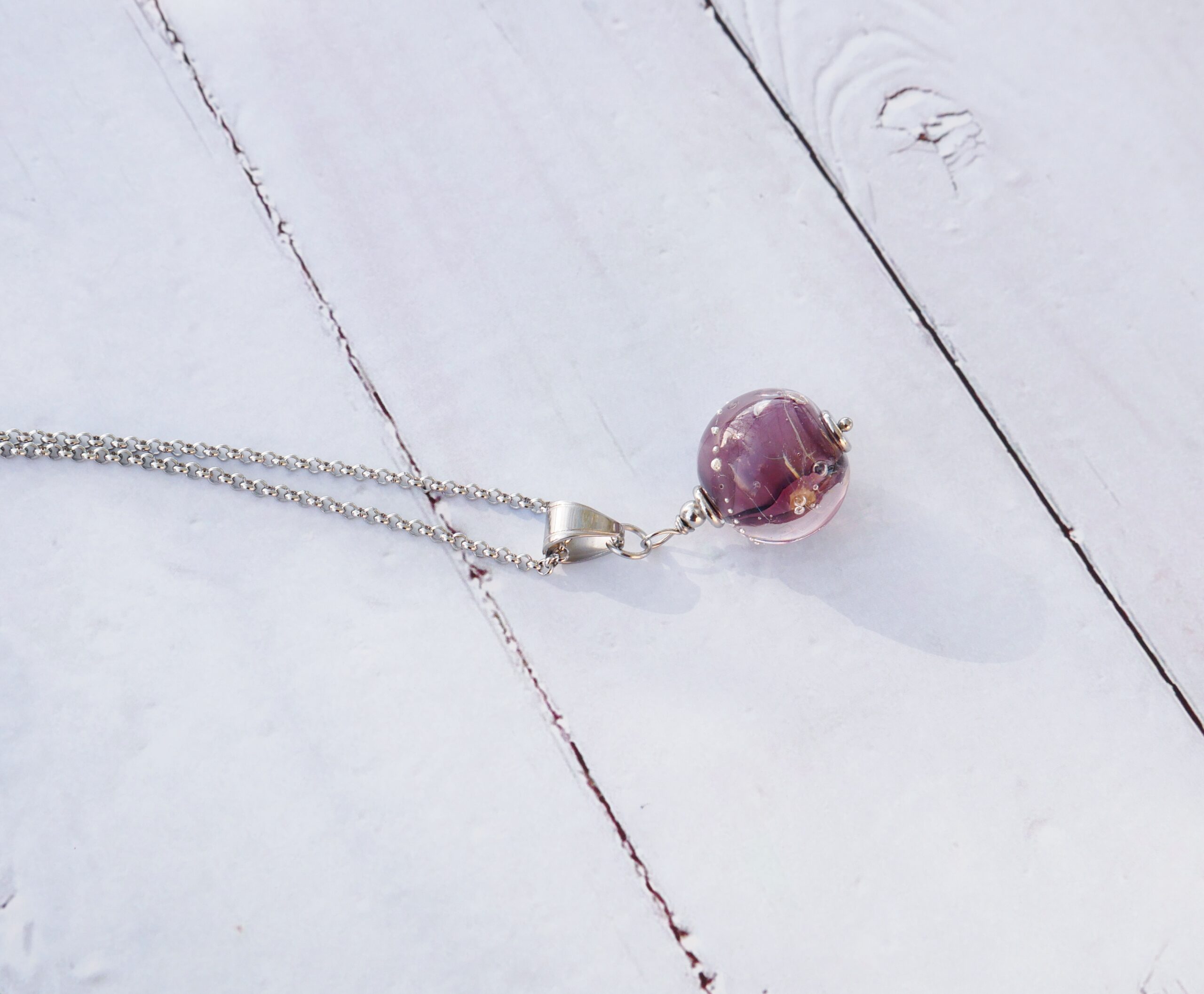 Joli collier avec sa perle violette/ améthyste . Un tourbillon et quelques bulles se cachent à l’intérieur !
