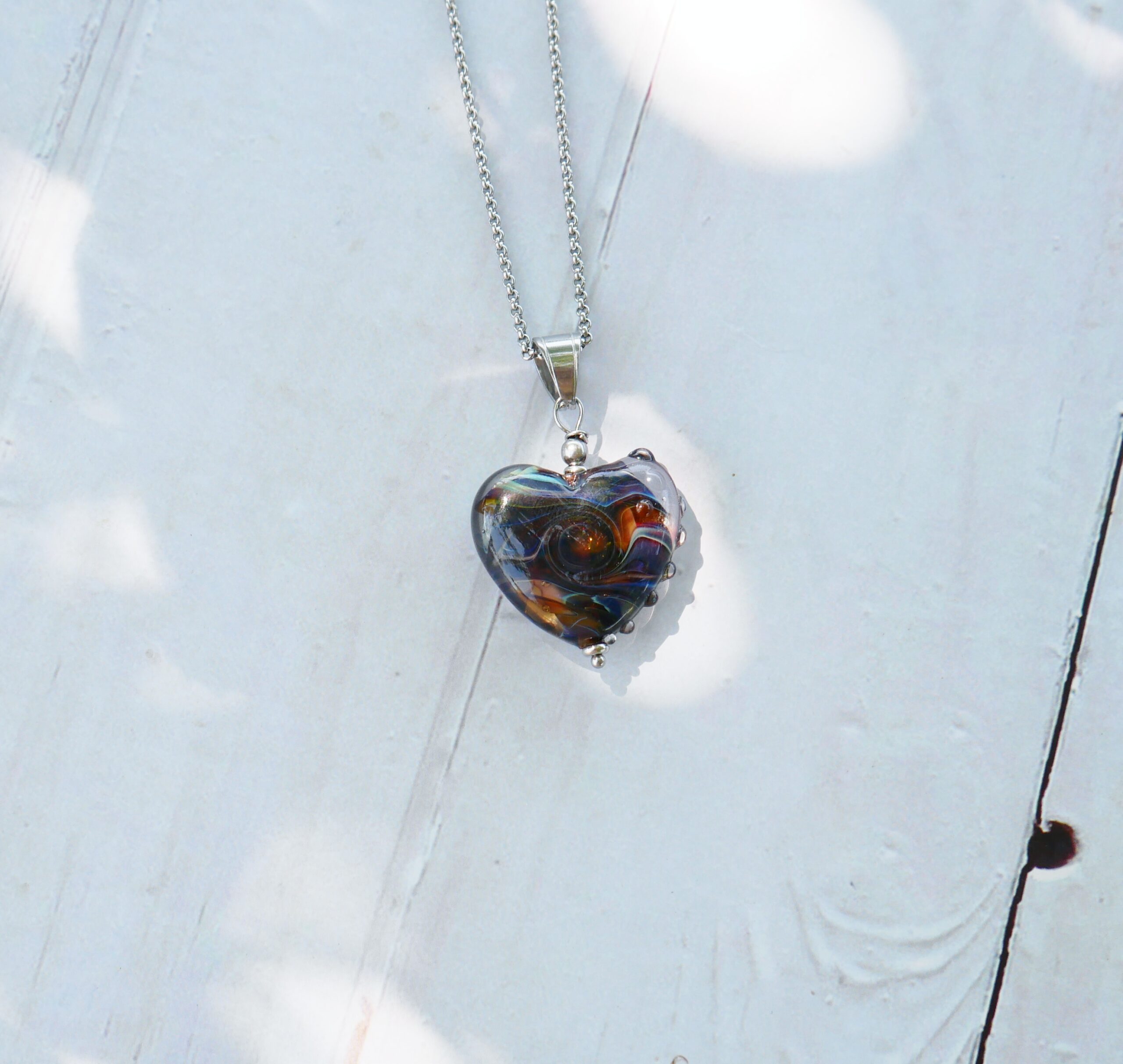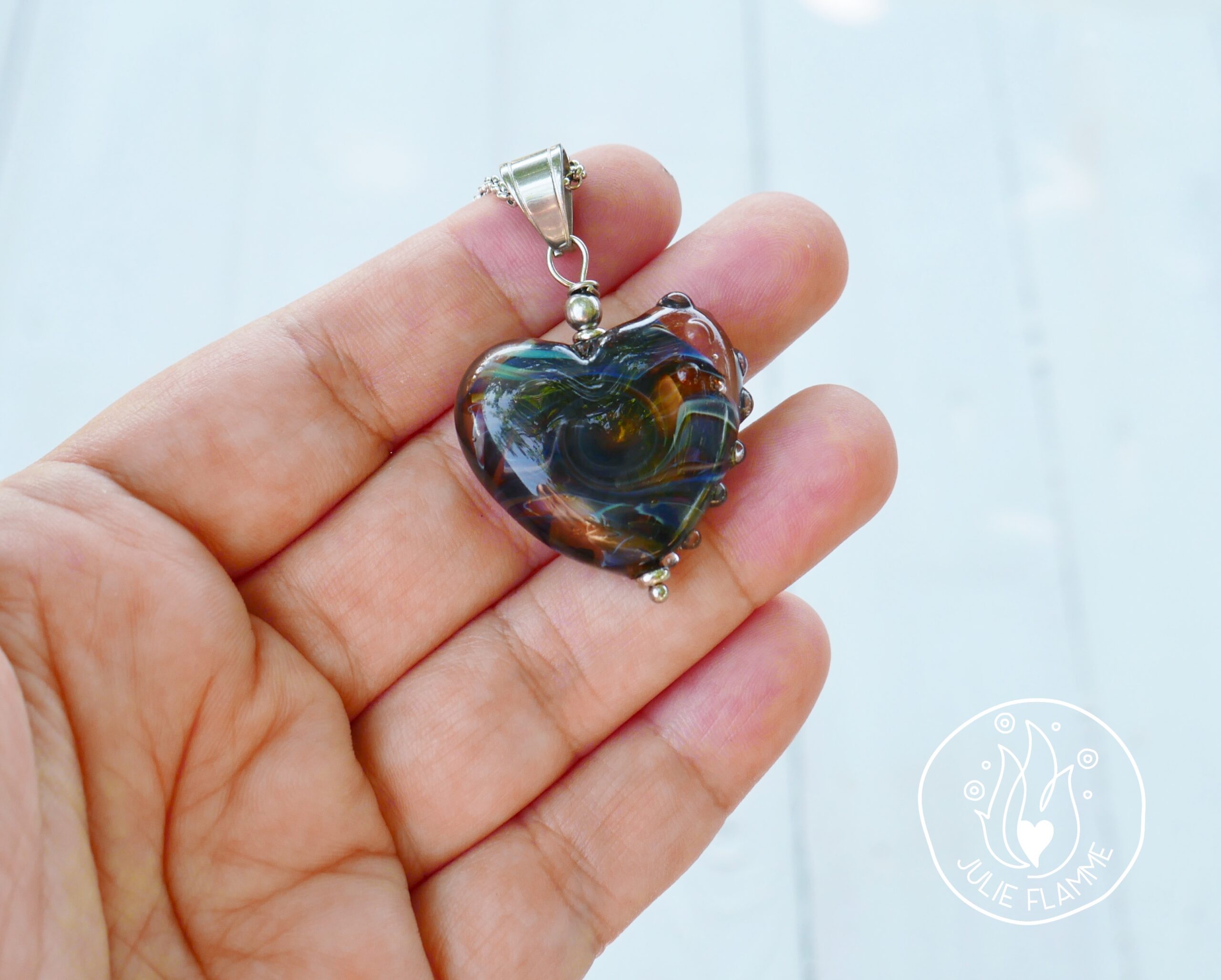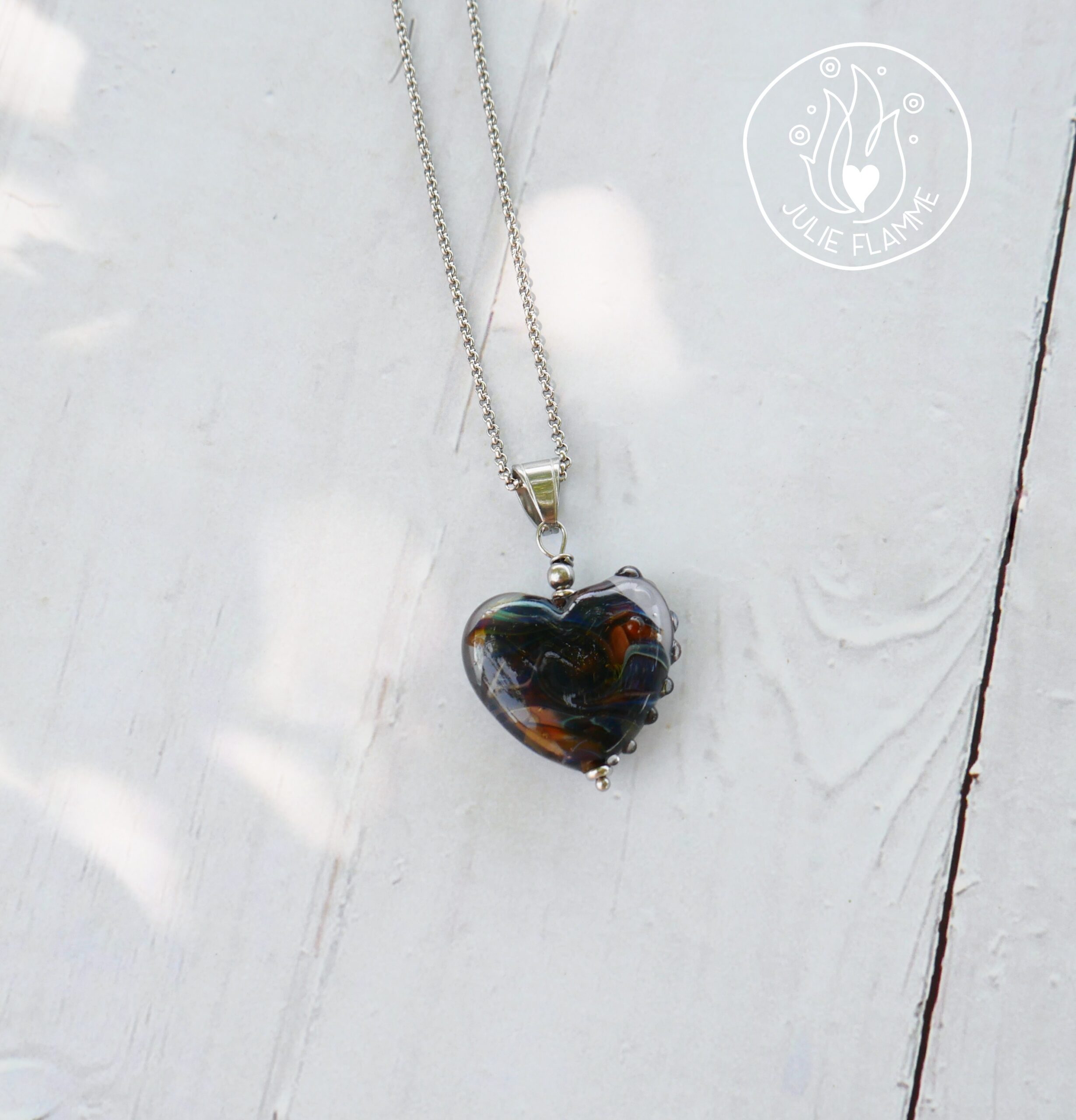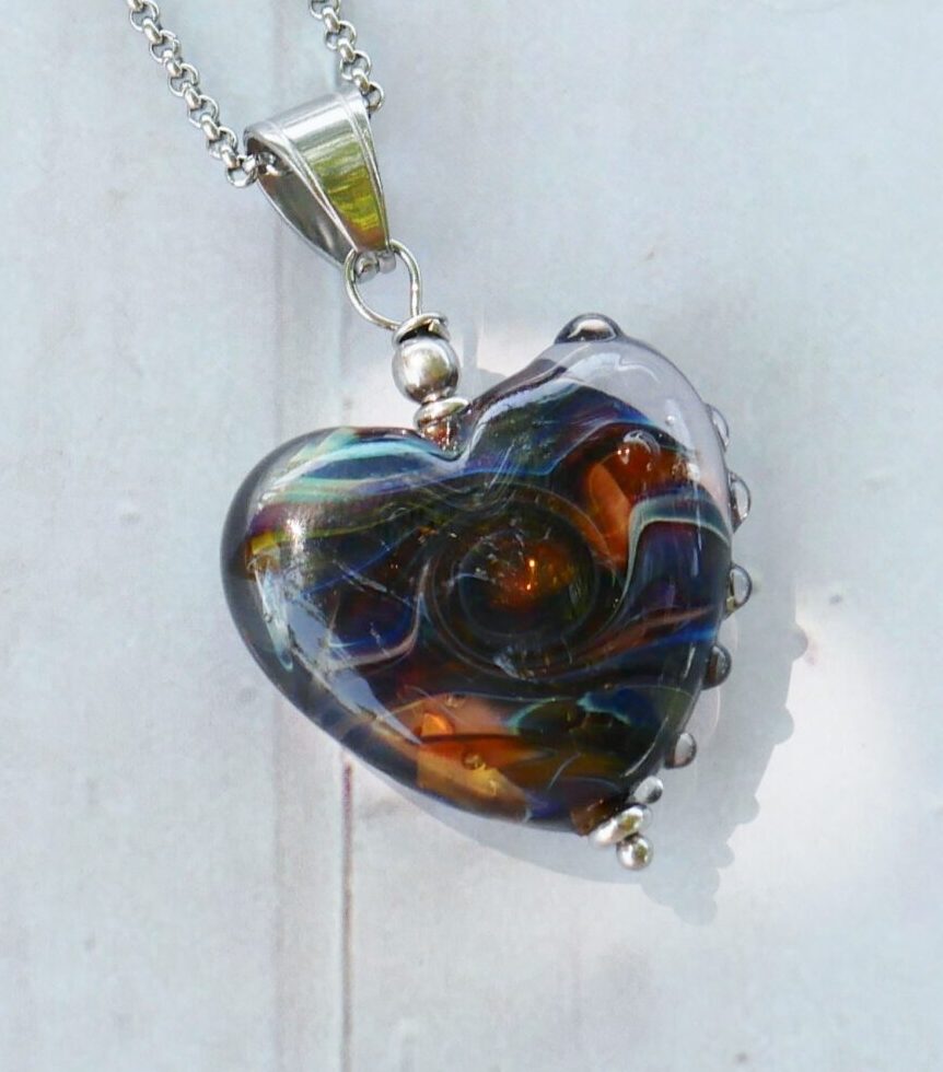 Les perles sont filées dans la flamme de mon chalumeau puis recuites au four professionnel pour lui assurer solidité et longévité.
